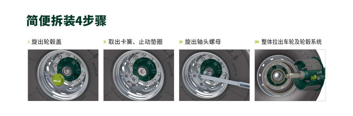VALX轮毂系统拆装便捷,简单4个步骤就能实现刹车片的更换。